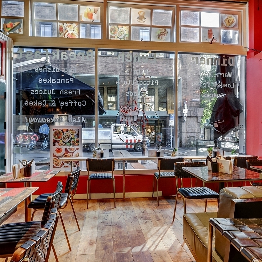 Horecaruimte (“horeca-4”) op begane grond 61 m2, kelder (opslag, wc en kantoor) 60 m2.